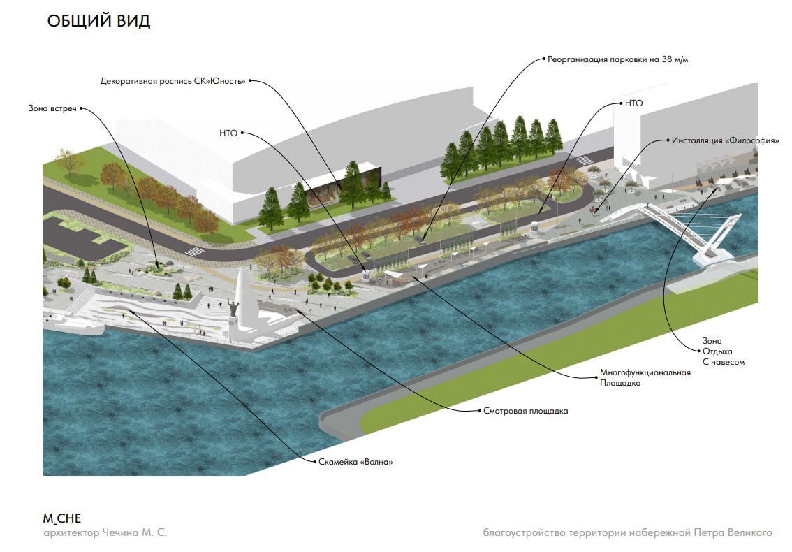 Начальная стоимость работ — 39,6 миллиона рублей. Как рассказали в мэрии, в рамках первого этапа приведут в порядок территорию около памятного знака рыбакам-пионерам океанического лова. Там сделают мощение территории, смонтируют архитектурную подсветку и установят малые архитектурные формы, среди которых — большая волнообразная скамейка и пять кадок с сакурами.