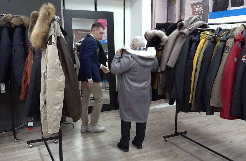 Размерный ряд — от 38 до 72. На весь ассортимент верхней одежды действуют скидки до 70%. Почему такие большие скидки? Представленный на выставке товар был завезён в страну до санкций, некоторые бренды ушли из страны и магазины закрылись. В страну производителя товар не вывезти, а хранить большие объёмы на складах — дорогостоящее мероприятие, поэтому весь ассортимент остатков решили продать в розницу по ценам в два-три раза ниже, чем они были ранее в магазинах.