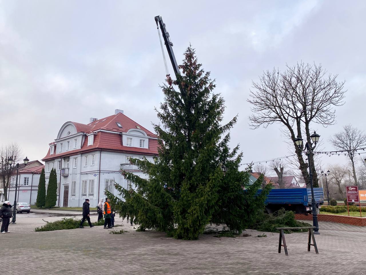 Зелёную красавицу высотой около 12 метров привезли из посёлка Вишнёвка. В ближайшее время дерево украсят новогодними игрушками и гирляндой.
