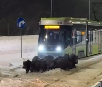 Из-за сильных снегопадов в восточной части Европы, которые также затронули Калининградскую область, дикие животные в Польше стали всё чаще выходить к людям. В соцсетях распростроняется видео, как десяток диких поросят оказались на трамвайных рельсах.