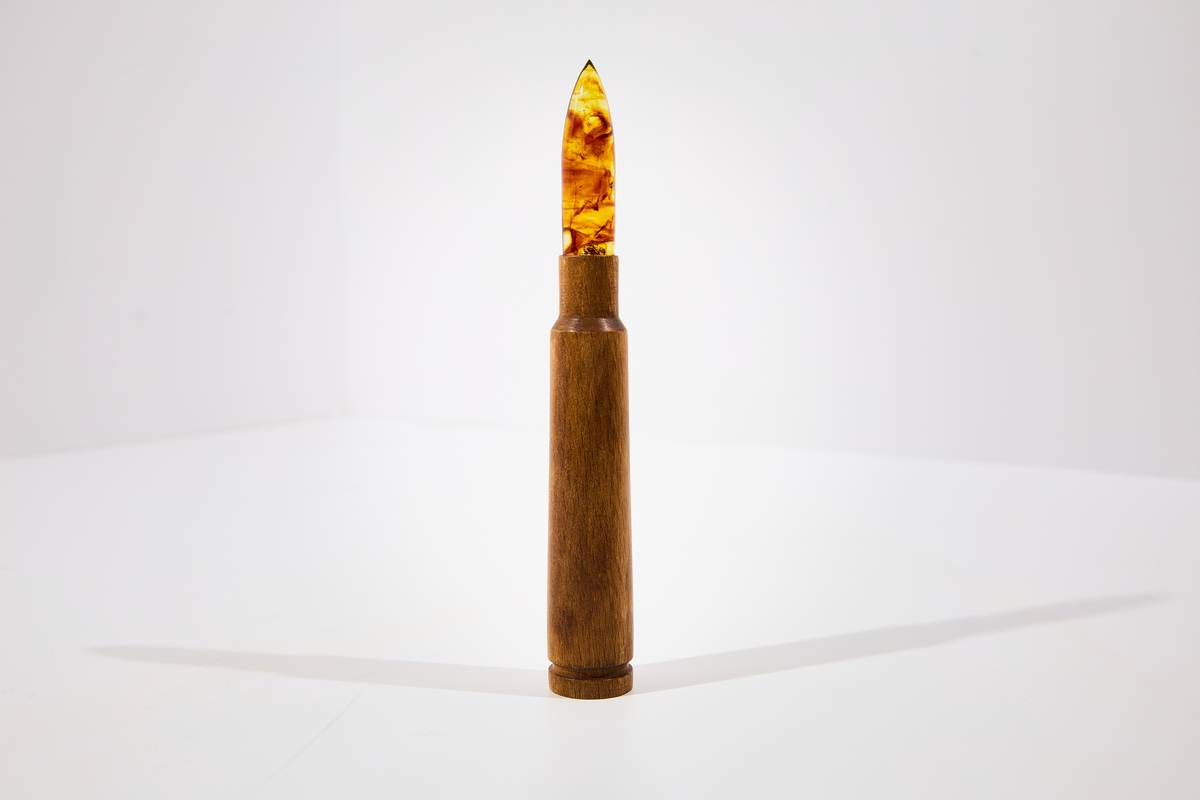 Чтобы создать янтарный крупнокалиберный патрон, специалисты использовали технологию прессования. Этот метод позволил под воздействием давления и температуры соединить отдельные фрагменты самоцвета в единую заготовку. Технологи комбинировали янтарь различных оттенков и меняли параметры прессования, с помощью этого удалось создать внутри заготовок особый рисунок.