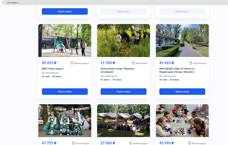 В субботу, 11 апреля, в регионе заработал сервис подачи заявок на приобретение путевок в загородные центры для детей. Бронирование открыли в 10 часов, и уже к 11:30 оказались полностью разобраны путёвки на смены в палаточные лагеря в Зеленоградске и Балтийске, а также в светлогорскую «Мечту» и лагерь Голикова.